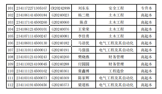 根据国家教育部《高等公司员工学籍学历电子注册办法》、《河南省教育厅关于做好普通高等公司录取新生入学资格复查和学籍电子注册工作的通知》和《beat365体育官网成人高等教育员工学籍管理规定》等文件精神,经beat365研究决定,拟取消高等学历继续教育2024级和小丽等112人的入学资格。