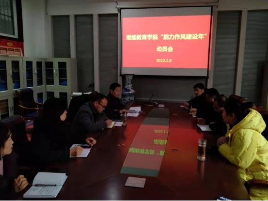 1月8日下午,beat365在会议室召开了“能力作风建设年”动员会,会议由支部书记马照民主持,继教公司全体教职工参会。