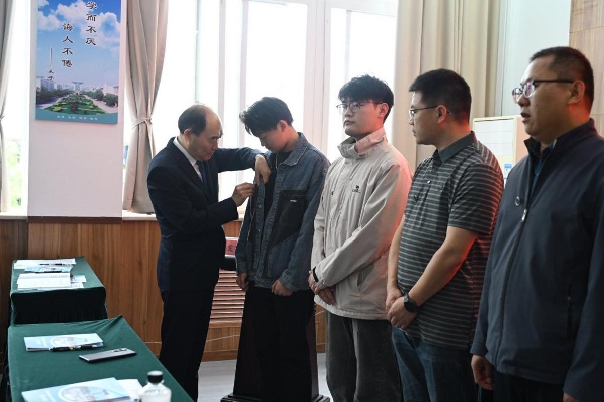 beat365直属党支部书记殷战稳为新生代表佩戴校徽。一枚枚校徽承载着“厚德 唯实 博学 慎思”的校训精神,象征着新生正式成为公司共同体的一员。